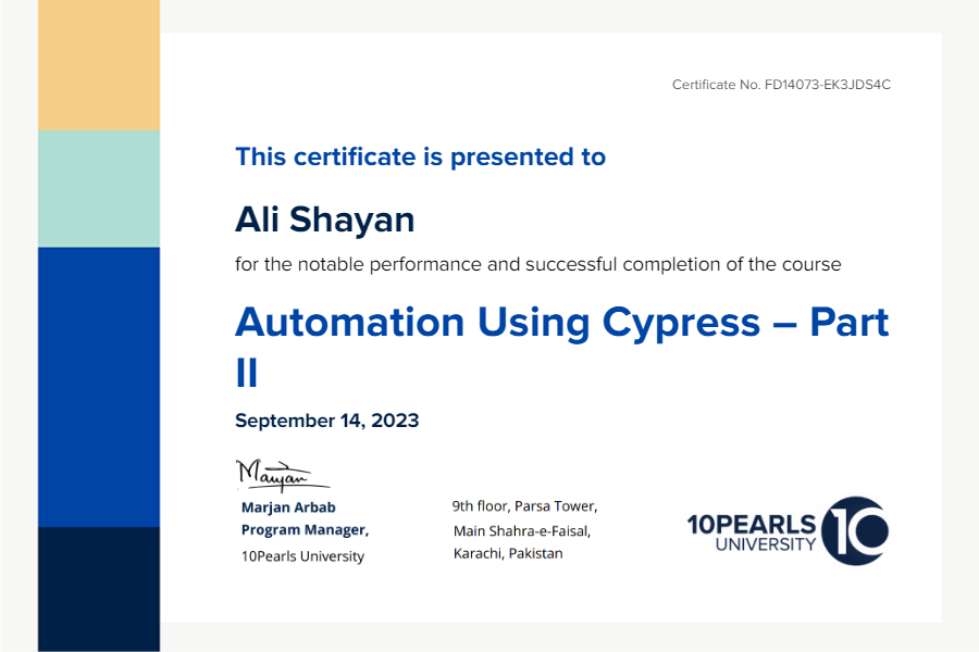 successfully completed the course Automation Using Cypress – Part II on