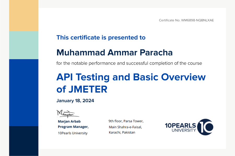 successfully completed the course API Testing and Basic Overview of JMETER on