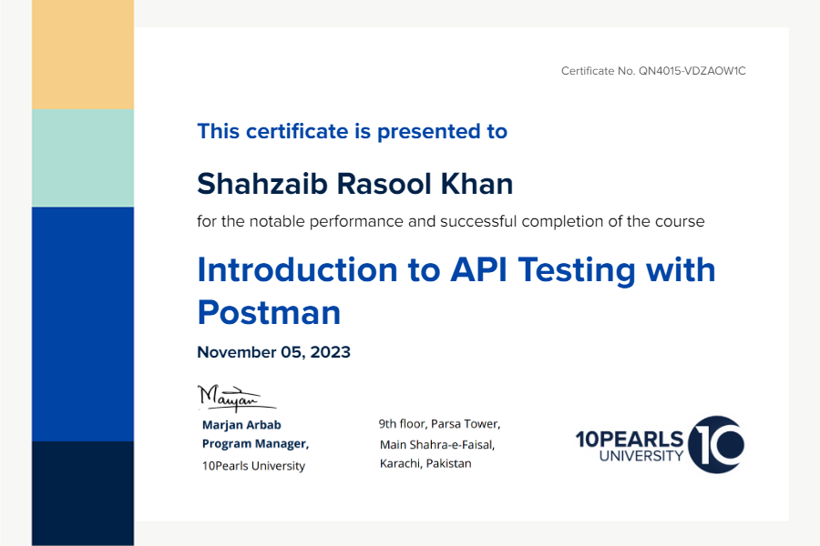 This certificate above verifies that Shahzaib Rasool Khan successfully completed the course Introduction to API Testing with Postman on November 05, 2023 as taught by Saad Ahmed Khan on 10Pearls University. The certificate indicates the entire course was completed as validated by the student.