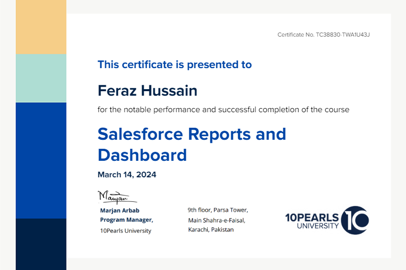 This certificate above verifies that Feraz Hussain successfully completed the course Salesforce Reports and Dashboard on March 14, 2024 as taught by Syed Shumail Mehdi on 10Pearls University. The certificate indicates the entire course was completed as validated by the student.