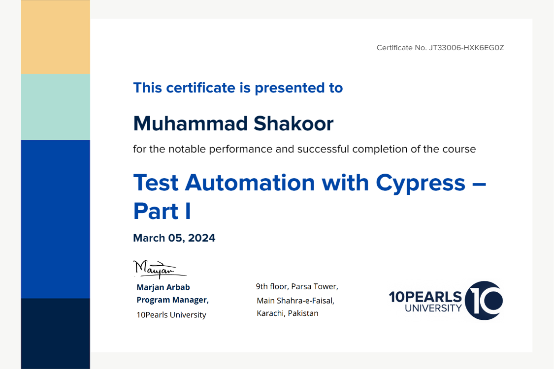 This certificate above verifies that Muhammad Shakoor successfully completed the course Test Automation with Cypress – Part I on March 05, 2024 as taught by jyteshpunjwani on 10Pearls University. The certificate indicates the entire course was completed as validated by the student.