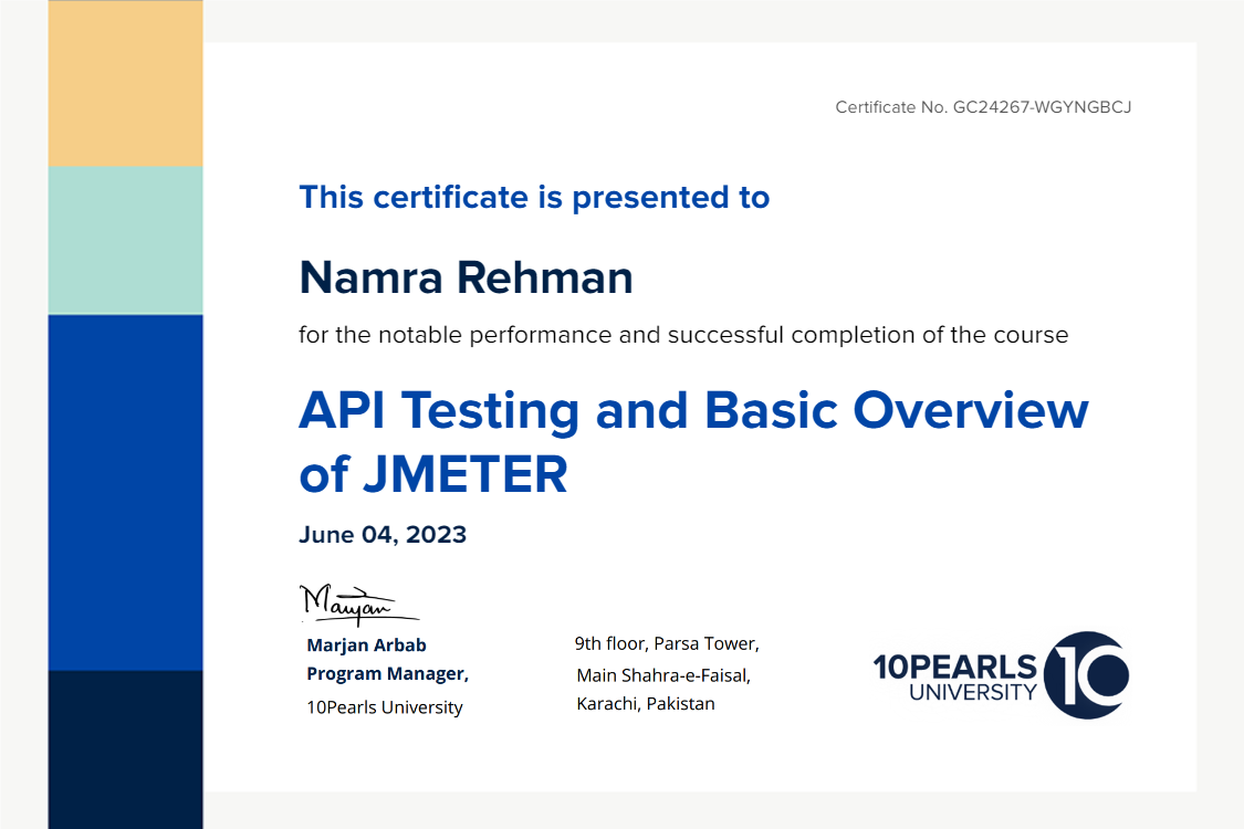 This certificate above verifies that Namra Rehman successfully completed the course API Testing and Basic Overview of JMETER on June 04, 2023 as taught by Anum Mirza on 10Pearls University. The certificate indicates the entire course was completed as validated by the student.
