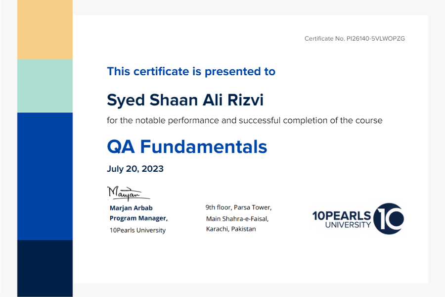 This certificate above verifies that Syed Shaan Ali Rizvi