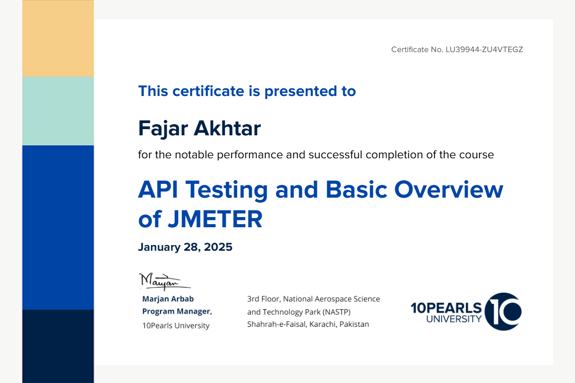 successfully completed the course API Testing and Basic Overview of JMETER on