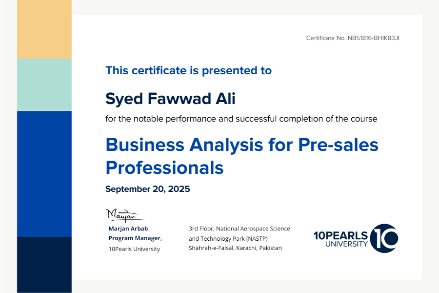 successfully completed the course Business Analysis for Pre-sales Professionals on