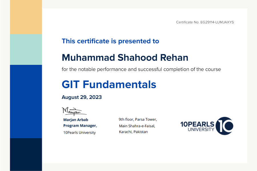 This certificate above verifies that Muhammad Shahood Rehan