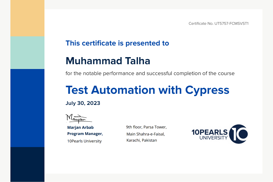 This certificate above verifies that Muhammad Talha successfully completed the course Test Automation with Cypress – Part I on July 30, 2023 as taught by jyteshpunjwani on 10Pearls University. The certificate indicates the entire course was completed as validated by the student.