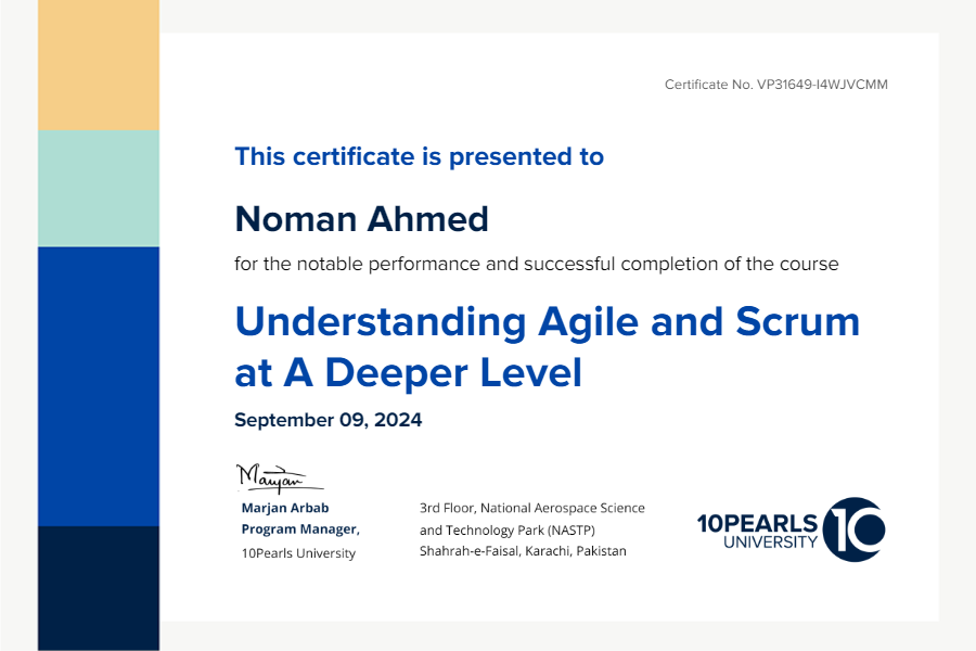 This certificate above verifies that Noman Ahmed successfully completed the course Understanding Agile and Scrum at A Deeper Level on September 09, 2024 as taught by Sanam Khan on 10Pearls University. The certificate indicates the entire course was completed as validated by the student.