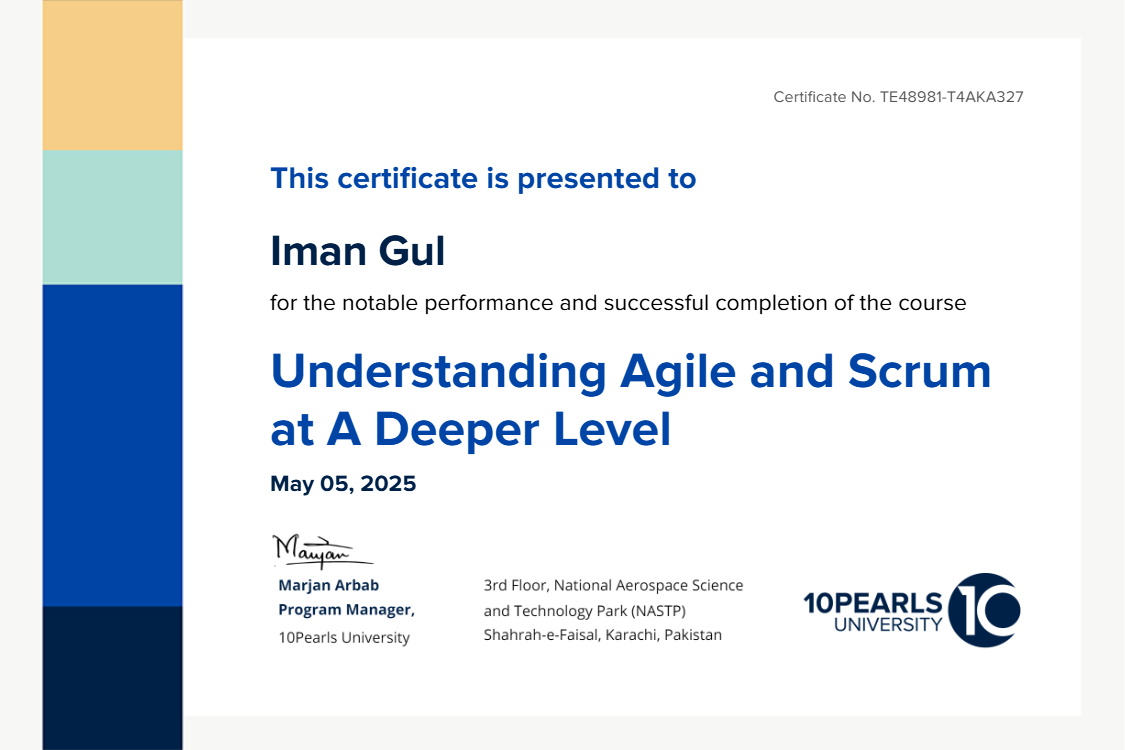 This certificate above verifies that Iman Gul successfully completed the course Understanding Agile and Scrum at A Deeper Level on May 05, 2025 as taught by Sanam Khan on 10Pearls University. The certificate indicates the entire course was completed as validated by the student.