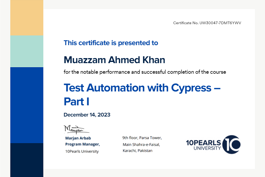 successfully completed the course Test Automation with Cypress – Part I on