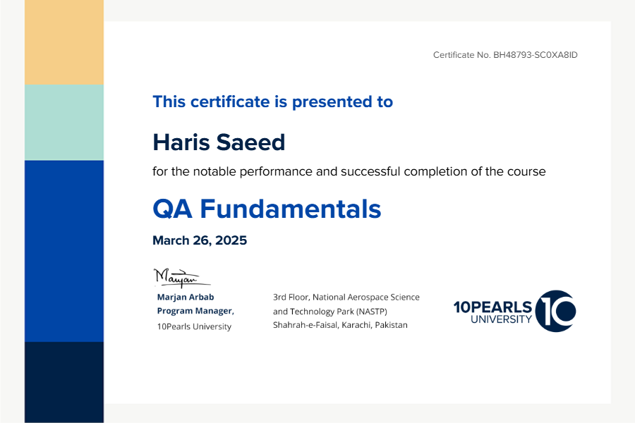 This certificate above verifies that Haris Saeed successfully completed the course QA Fundamentals on March 26, 2025 as taught by Bisma Latif on 10Pearls University. The certificate indicates the entire course was completed as validated by the student.