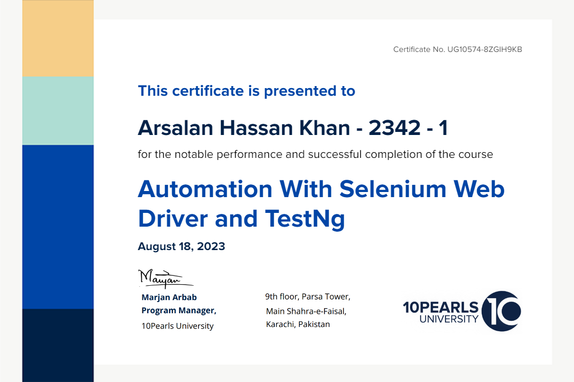 This certificate above verifies that Arsalan Hassan Khan