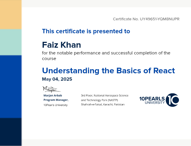 This certificate above verifies that Faiz Khan