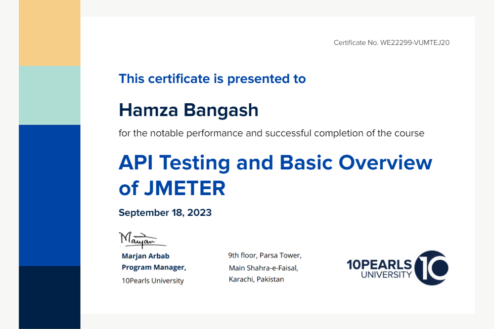 This certificate above verifies that Hamza Bangash successfully completed the course API Testing and Basic Overview of JMETER on September 18, 2023 as taught by Anum Mirza on 10Pearls University. The certificate indicates the entire course was completed as validated by the student.