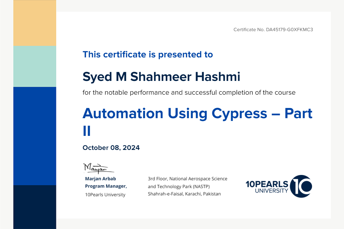This certificate above verifies that Syed M Shahmeer Hashmi