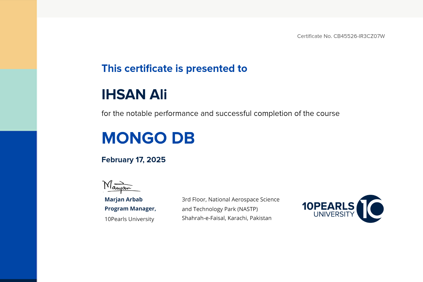 This certificate above verifies that IHSAN ALI successfully completed the course MONGO DB on February 17, 2025 as taught by Muhammad Arsalan on 10Pearls University. The certificate indicates the entire course was completed as validated by the student.