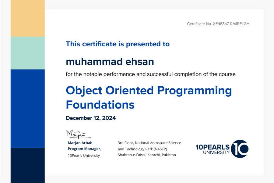 successfully completed the course Object Oriented Programming Foundations on