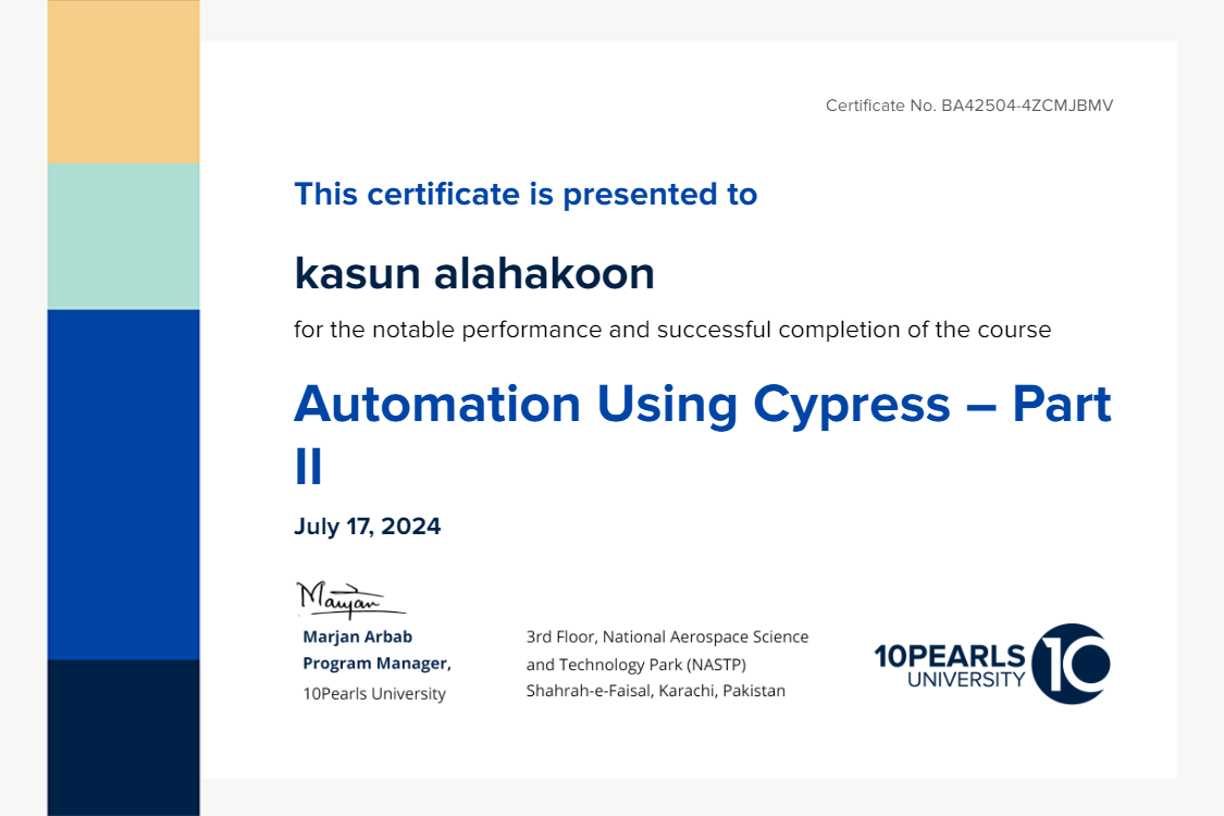 This certificate above verifies that kasun alahakoon successfully completed the course Automation Using Cypress – Part II on July 17, 2024 as taught by jyteshpunjwani on 10Pearls University. The certificate indicates the entire course was completed as validated by the student.