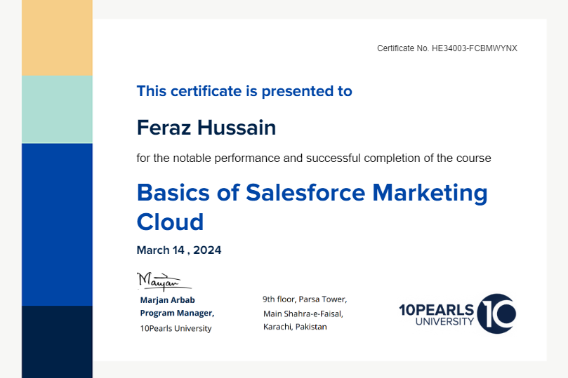 This certificate above verifies that Feraz Hussain successfully completed the course Basics of Salesforce Marketing Cloud on March 14, 2024 as taught by Myra Rafique Khan on 10Pearls University. The certificate indicates the entire course was completed as validated by the student.