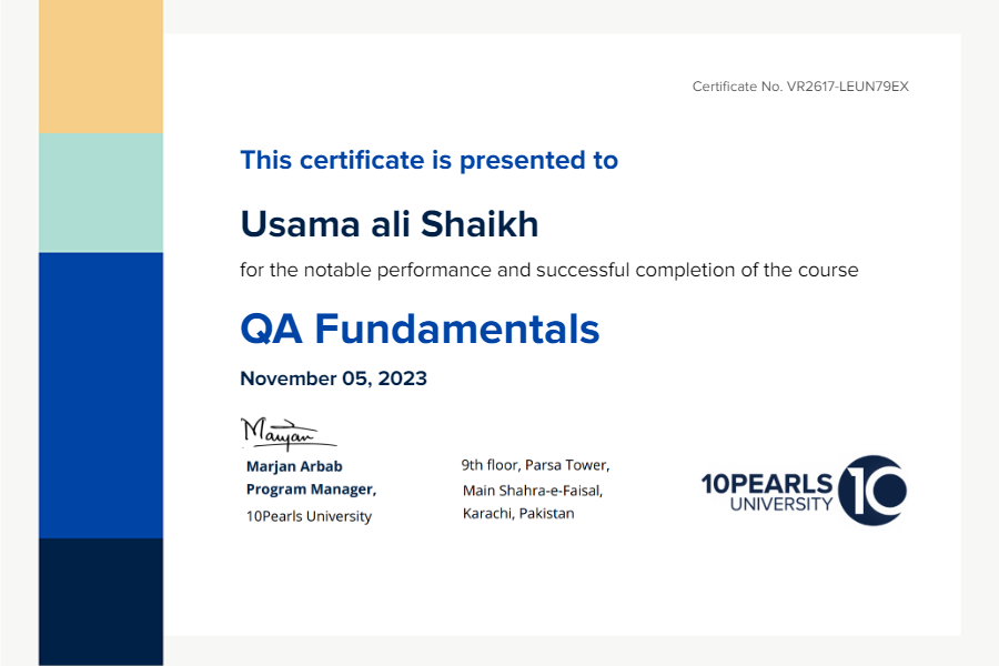This certificate above verifies that Usama ali Shaikh successfully completed the course QA Fundamentals on November 05, 2023 as taught by Bisma Latif on 10Pearls University. The certificate indicates the entire course was completed as validated by the student.