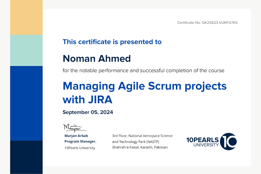 This certificate above verifies that Noman Ahmed