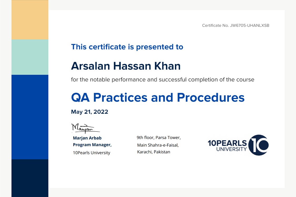 This certificate above verifies that Arsalan Hassan Khan successfully completed the course QA Practices and Procedures on May 21, 2022 as taught by Shahbaz Qaiser on 10Pearls University. The certificate indicates the entire course was completed as validated by the student.