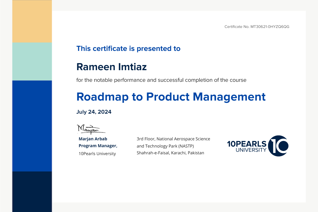 This certificate above verifies that Rameen Imtiaz successfully completed the course Roadmap to Product Management on July 24, 2024 as taught by Rutaba Ashraf on 10Pearls University. The certificate indicates the entire course was completed as validated by the student.