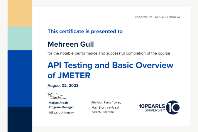 This certificate above verifies that Mehreen Gull successfully completed the course API Testing and Basic Overview of JMETER on August 02, 2023 as taught by Anum Mirza on 10Pearls University. The certificate indicates the entire course was completed as validated by the student.