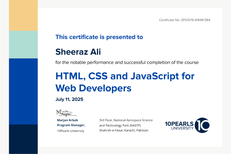 This certificate above verifies that Sheeraz Ali successfully completed the course HTML, CSS and JavaScript for Web Developers on July 11, 2025 as taught by Adeel Shehzad on 10Pearls University. The certificate indicates the entire course was completed as validated by the student.