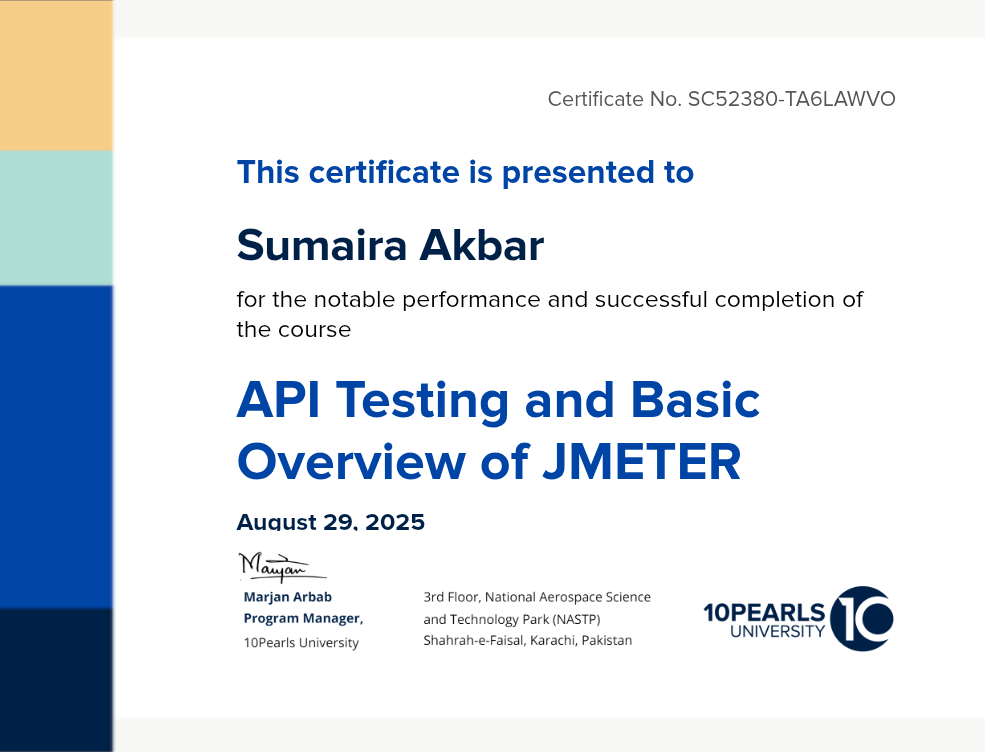 This certificate above verifies that Sumaira Akbar successfully completed the course API Testing and Basic Overview of JMETER on August 29, 2025 as taught by Anum Mirza on 10Pearls University. The certificate indicates the entire course was completed as validated by the student.
